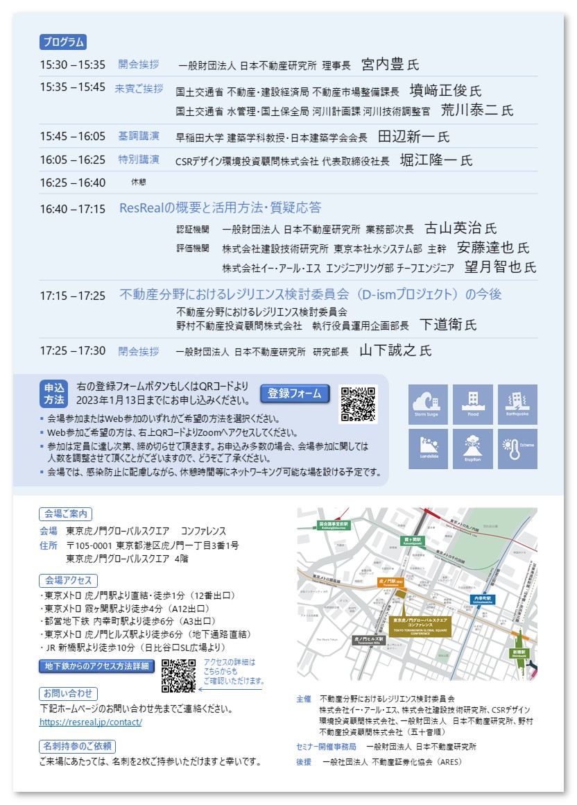 不動産のレジリエンスに関する新たな認証制度「ResReal(レジリアル)」の公開セミナーを開催いたします。